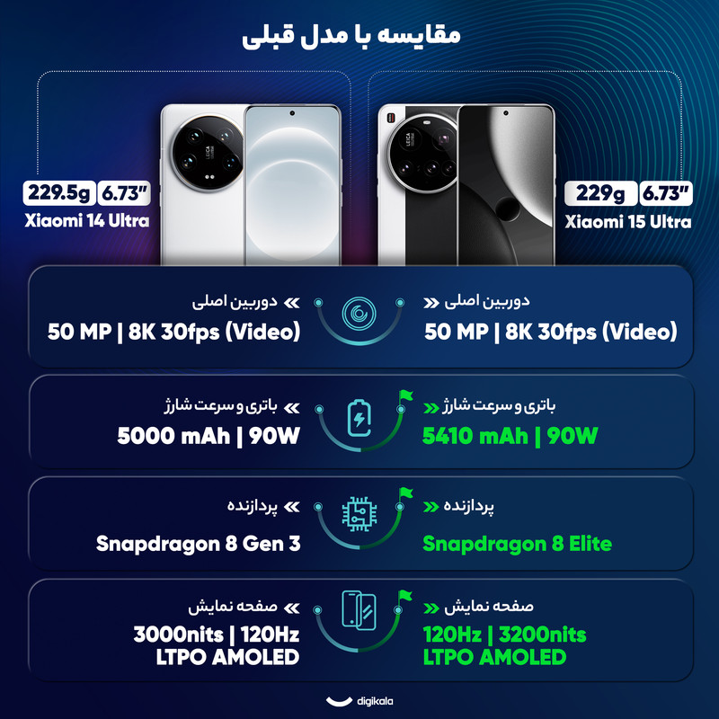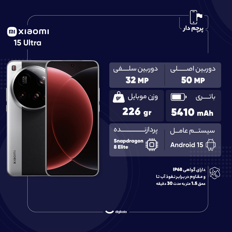 گوشی Xiaomi 15 Ultra جدیدترین پرچمدار شیائومی است که با تمرکز ویژه بر توانمندیهای تصویربرداری، طراحی لوکس و قدرت سختافزاری بیرقیب وارد میدان رقابت شده است و یک تهدید جدی برای پرچمداران سامسونگ و اپل محسوب میشود. این گوشی با بدنهای از جنس فیبر شیشهای یا چرم مصنوعی، نمایشگری 6.73 اینچی از نوع LTPO AMOLED با روشنایی خیرهکننده 3200 نیت، و چیپ قدرتمند Snapdragon 8 Gen 4 Elite با لیتوگرافی 3 نانومتری، ترکیبی کامل از زیبایی و قدرت را ارائه میدهد. ستارهی اصلی Xiaomi 15 Ultra، ماژول دوربین چهارگانه 50 مگاپیکسلی با همکاری شرکت لایکا است که شامل لنز اصلی با سنسور 1 اینچی، یک لنز تلهفوتو با فوکوس نزدیک، یک لنز پریسکوپ قدرتمند، و یک لنز فوق عریض میشود. این گوشی همچنین از فیلترهای 67 میلیمتری پشتیبانی میکند و یک کیت عکاسی حرفهای هم برای آن عرضه شده که تجربهای شبیه به دوربینهای DSLR را فراهم میکند. باتری سیلیکون-کربنی 5410 میلیآمپرساعتی با شارژ سیمی 90 وات و بیسیم 80 وات، رابط HyperOS 2.0، پشتیبانی از Wi-Fi 7، بلوتوث 6 و ارتباط ماهوارهای دوطرفه، از دیگر ویژگیهای ممتاز این پرچمدار هستند. در مجموع اگر به دنبال خرید گوشیای هستید که هم در عملکرد، هم در طراحی، و هم در عکاسی بیرقیب باشد و هم قیمت پایینتری از پرچمداران سایر برندها داشته باشد،Xiaomi 15 Ultra پاسخی کامل به انتظارات شماست.